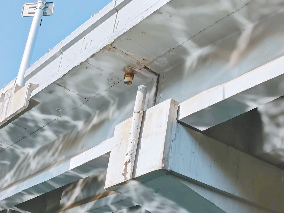 在通惠河上的四惠桥南隔邻不雅察,该处多个排水管谈贯串处有管件缺失问题,还有的排水管谈已不见思路,雨水由管谈缺口处告成流泻至桥体横梁,横梁局部腐蚀且老化,雨水流过脏兮兮、黑魆魆。笔者不雅察发现,该类情况有10余处。