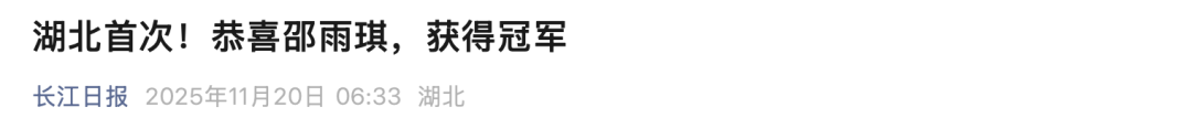 尔后,邵雨琪先后夺得2021年室内田径邀请赛冠军、2022年寰球田径大奖赛冠军、2024年寰球田径锦标赛冠军。2025年11月19日,她更是在全运会「女子跳高」的赛场上,凭借“1.90米”的收获,夺得冠军,为家乡湖北,赢得了首枚全运会跳高金牌。